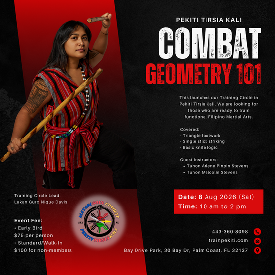 Aug 08, 2026, 10:00 AM – 2:00 PM EDTBay Drive Park, 30 Bay Dr, Palm Coast, FL 32137, USAJoin our Pekiti Tirsia Kali Training Circle in Jacksonville FL, where participants can experience functional Filipino Martial Arts and build a committed training community. Training will introduce triangle footwork, single-stick striking, and basic knife logic.